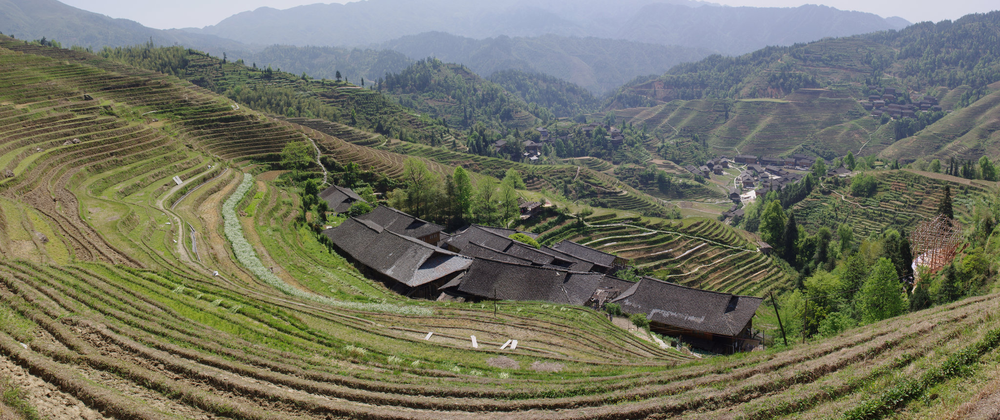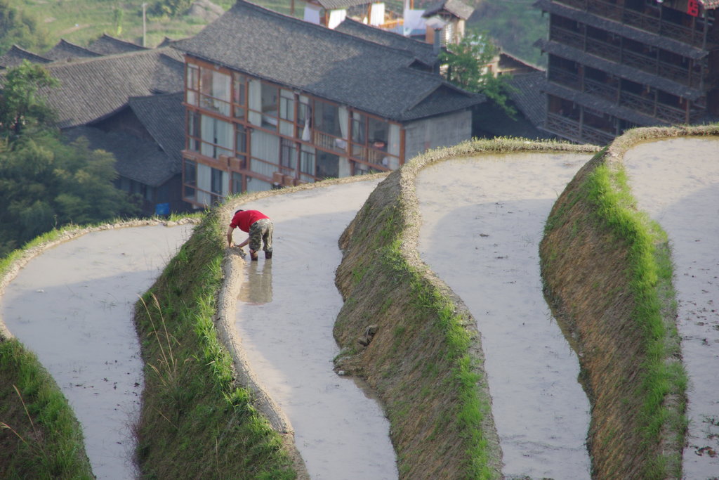 La ballade passe dans des terrasses un peu reculées. Certaines ne sont pas utilisées. En jachère peut-être ? Au détour d’un virage nous faisons un bond. Un serpent d’un bon mètre cinquante de long, aussi effrayé que nous, se tord dans tous les sens pour essayer de grimper le talus. Après ces émotions, nous découvrons enfin les terrasses de Ping’An. Elles viennent épouser la moindre bosse autour du village. Certaines sont en eau et d’autres sont vertes de cultures, offrant ainsi un tableau fort sympathique. Le village de Ping’An lui même a perdu beaucoup de son charme. Les rues sont couvertes de vendeurs de tout et de rien ou d’hôtels et les paisibles paysans ont céder leur place aux rabatteurs de tout poil.