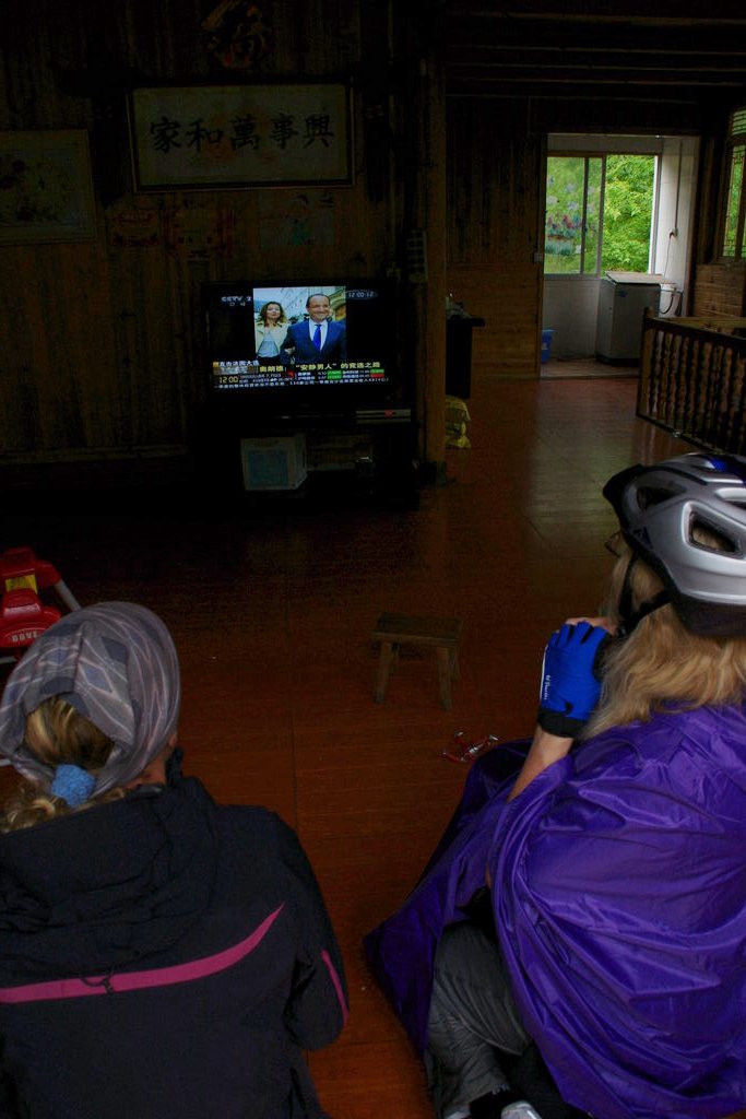 Quelle chance nous avons eu hier. Aujourd’hui le ciel est bouché et nous envoie de grosses gouttes en averses rapprochées. A tel point que nous prenons notre temps à savourer nos nouilles au porc du petit déjeuner avant d’enfourcher nos bécanes. Nous profitons d’une légère éclaircie pour nous mettre en route. Cette fois c’est de jour que nous refaisons cette fameuse route qui nous en avait fait tant baver à l’arrivée et elle descend. Elle ne fait que ça d’ailleurs. 14 kilomètres de descente rarement interrompue. Un régal. Même les quelques gouttes qui reviennent fréquemment nous frapper le visage ne peuvent gâter ce plaisir. Au passage d’une maison Sébastien s’arrête net. La télé qui trône fièrement au milieu de la pièce affiche en gros un visage bien connu, celui de François Hollande. Apparemment les élections françaises intéressent les chinois. Nous passons tous les 3 la tête à travers la porte pour voir de quoi il retourne. Les deux grands mères se retournent étonnées et nous proposent tout de suite des chaises pour apprécier plus confortablement les nouvelles. À voir comme la CCTV insiste sur le camarade François et sur Sarko nous imaginons l’issue du premier tour. Les autres candidats passent très furtivement de temps en temps. Nous ne pensions pas avoir si rapidement des nouvelles. Surtout pas dans cette vallée encaissée qui semble à mille lieu de la politique française.