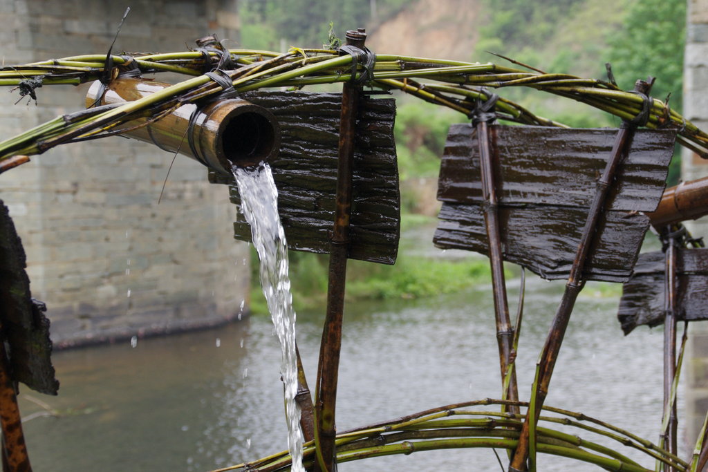 Nous partons en ballade le long de la rivière en passant à travers de nombreux villages. Ils sont clairement prêts pour accueillir du tourisme, mais ont tout de même réussi à conserver un charme et une atmosphère authentique fort plaisante. Les nombreuses constructions récentes gardent le style local sans trop dénaturer les lieux. Chaque village, aussi petit soit-il, possède au moins un pont, une scène de théâtre de plein air, une tour à tambour et une salle couverte où le village se retrouve pour discuter, pour jouer aux cartes ou tout simplement pour regarder ensemble la télé. Côté rivière, les berges sont jalonnées de roues à eau en bambou dont certaines ne servent pas qu’à la décoration. Une façon bien astucieuse d’automatiser l’immersion des rizières.
