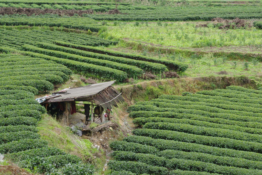 Nous arrivons dans un premier village un peu lugubre. Les gens n’y sont pas très sympathiques et pour une première fois on nous regarde un peu de travers. Il n’y a toujours pas de restaurant, mais finalement nous ne nous y serions peut être pas arrêtés. Au village suivant nous retrouvons des chinois très charmants. Cela nous est arrivé un peu partout dans le monde. Quand un village n’inspire guère confiance il suffit de passer au suivant pour retrouver un peu plus de chaleur humaine. Mais toujours pas de restaurant. La route bitumée cède sa place à un chemin caillouteux et se remet à monter. Vu l’heure tardive et la distance qui nous sépare de la prochaine ville, nous décidons de camper. Au détour d’un virage, Laetitia nous déniche une belle petite terrasse éloignée de la route et des villages alentour. Nous voilà donc à poser notre tente à coté d’un jardin de thé. Nous faisons rapidement la popote avant de nous glisser dans les duvets. Ici, il n’y a pas de distractions pour nous tenir éveillés tard.