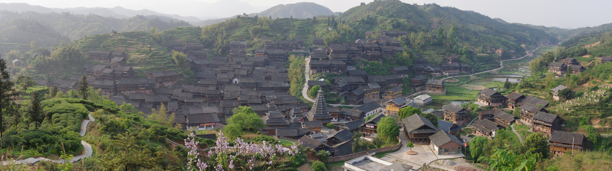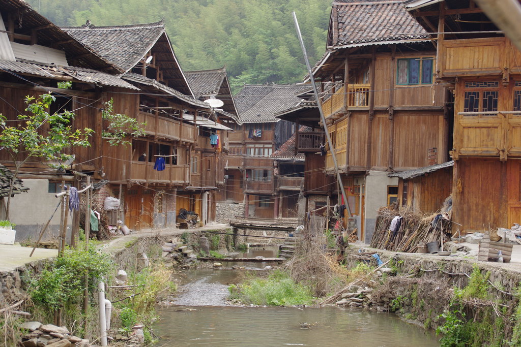 Le village de Dazhai est assez touristique mais il montre toute fois quelques signes d’authenticité appréciable. Un rivière y coule tranquillement, le séparant en deux parties joignables par une multitude de ponts plus ou moins évolués. La partie basse du village est essentiellement composée de structures pour accueillir les touristes. Tous ces bâtiments neufs ont tout de même su conserver l’architecture locale. Les toitures à 4 pans couvertes de grosses tuiles grises épaisses sont décorées sur les arêtes et les coins par des petites statuettes ou des enchevêtrements de tuiles. Elles sont posées sur une structure en bois rectangulaire faite d’un quadrillage de poutres verticales. Les murs sont percés d’ouvertures finement décorées.