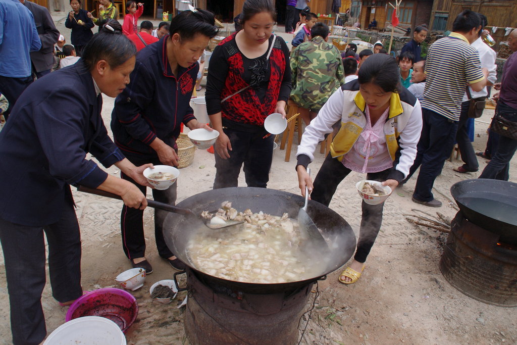 Comme à notre habitude, nous choisissons le restaurant du midi au pif le plus complet. Deux boutiques se battent les passants. Une est pleine, l’autre est vide. Va pour la pleine. Nous ne sommes d’ailleurs pas déçus. Les filles commandent une assiette de pousses de bambous frites accompagnée de porc des plus sympathiques. Un plat parfait pour lester l’estomac et finir les quelques kilomètres qui nous séparent de Longsheng. La ville de Longsheng n’a pas grand chose pour attirer les touristes qui tendent plutôt à dormir à Longji. Pour nous, l’intérêt du lieu réside dans sa gare routière d’où nous récupérons un bus pour avancer un peu plus vite en direction de Sanjiang.