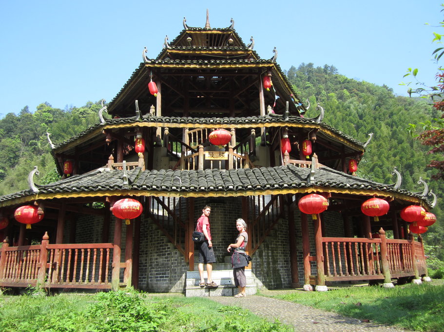 La région est fameuse pour son Pont du Vent et de la Pluie. Du moins c’est l’image que nous en avions avant de venir. En réalité, ce sont une myriade de ce genre de pont que l’on trouve sur place. Ils sont construits en rondins de sapins maintenus par tenons et mortaises sans clou, sans vis. Appelés officiellement ponts en galerie, ce sont donc des couloirs de bois couverts posés sur de forts piliers en pierre, dont la toiture élaborée est ponctuée de tourelles en forme de pagode. Quelques éléments de décor viennent agrémentés l’ensemble, sculptures d’oiseaux, dragons, poissons, etc.