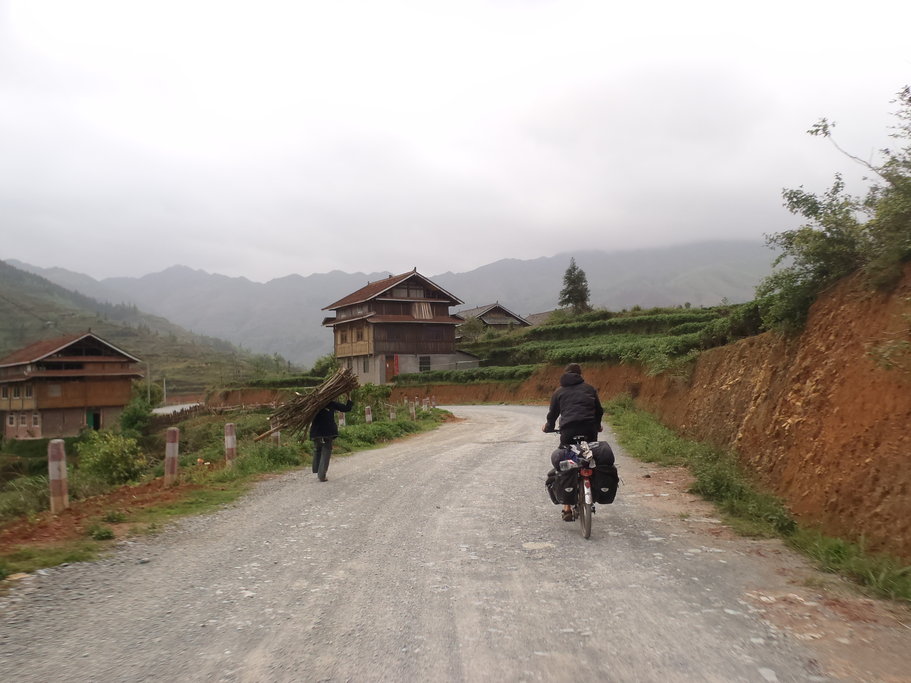 Pour repartir d’ici c’est tout d’abord une belle descente de quelques kilomètres histoire de redémarrer doucement. Le programme de la journée s’annonce correcte avec tout de même un peu de montée en prévision. Notre itinéraire évite soigneusement la route principale en passant dans des vallées paisibles où nous sommes vraiment peu dérangés par la circulation. La route est bordée de pans de montagne couverts de bambou. Ceux-ci sont coupés puis amenés dans de petites structures locales où ils fabriquent des tapis de bambou, des espèces de lampions et tout un tas d’autres artefacts. Les faciès ont changés. Les gens sont bien plus petits et menus et leur visage très rond est très dégagé avec un front haut, des pommettes hautes, un menton très peu saillant et de petits yeux très bridés.