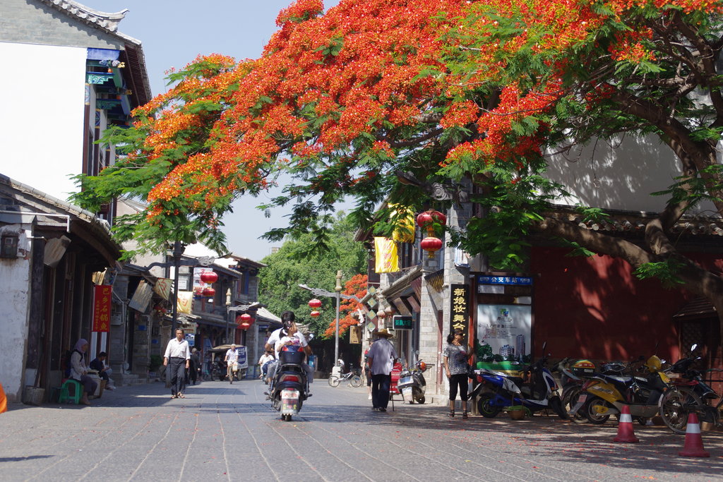 4h plus tard nous arrivons dans la gare routière décrépite de Jianshui. La ville semble assez triste. Les rues sont mornes et poussiéreuses et les façades toutes semblables sont fades. Mais après avoir passé la porte imposante de la vielle ville, c’est un autre monde qui s’offre à nos yeux. Les ruelles maintenant pavées sont bordées de beaux flamboyants rouges de fleurs et les enseignes lumineuses des magasins n’ont pas entièrement recouvert les anciennes façades en bois peintes d’estampes chinoises en noir et blanc ou de motif géométriques colorés. La décoration va jusqu’aux plaques d’égout en pierre, sculptées de motifs d’animaux. Un vrai petit bijoux.