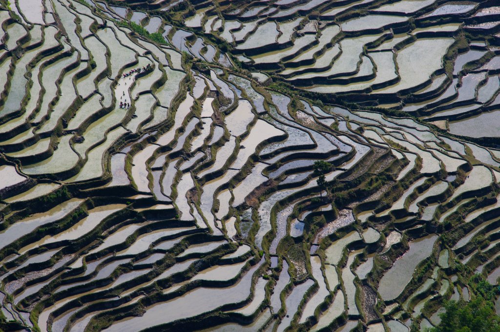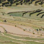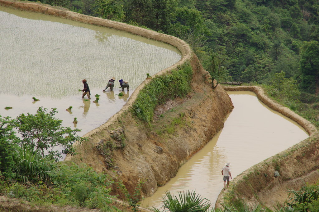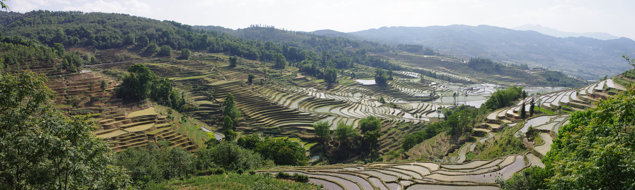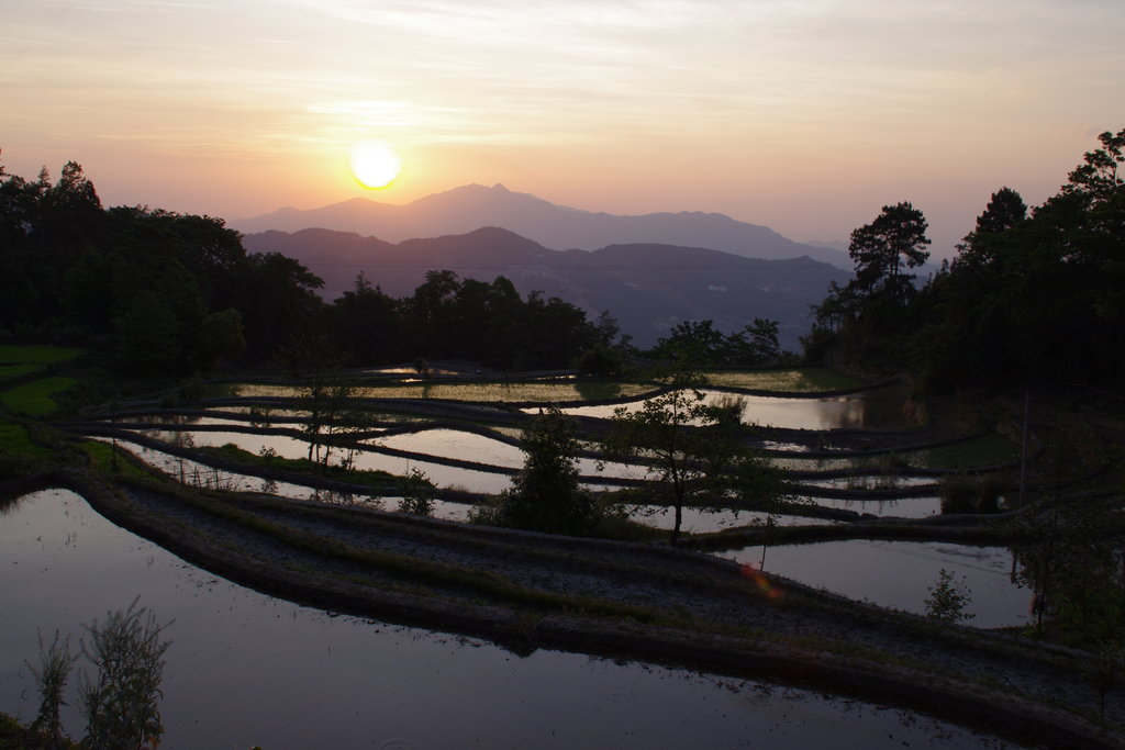 A Xinjie, nous sommes accueillis par un soleil de plomb. La ville est pourtant assez haute, mais la chaleur est écrasante. Il faut une petite quinzaine de kilomètres pour rejoindre les parcs de terrasses qui font l’attraction locale, puis une autre pour rejoindre le village où nous voulons dormir ce soir. Le début de la route n’a pas beaucoup d’intérêt et nous croisons les doigts pour ne pas être venus pour rien. Après tout, nous avions déjà vu les terrasses de Longji, peut-être était-ce suffisant ? Nous voyons quelques terrasses mignonnettes, mais rien d’impressionnant. Arrive un premier point de vue, d’où le spectacle du soleil couchant serait splendide. Nous posons les vélos et allons voir de quoi il retourne. Wow … la vue depuis la route ne laissait pas deviner ce qui se cachait derrière les arbres. Une belle mosaïque de terrasses en eau recouvre la large vallée que nous avons devant les yeux. Le détour valait donc bien la peine.