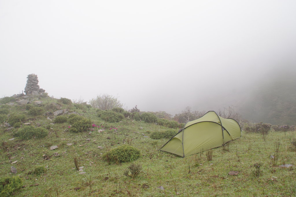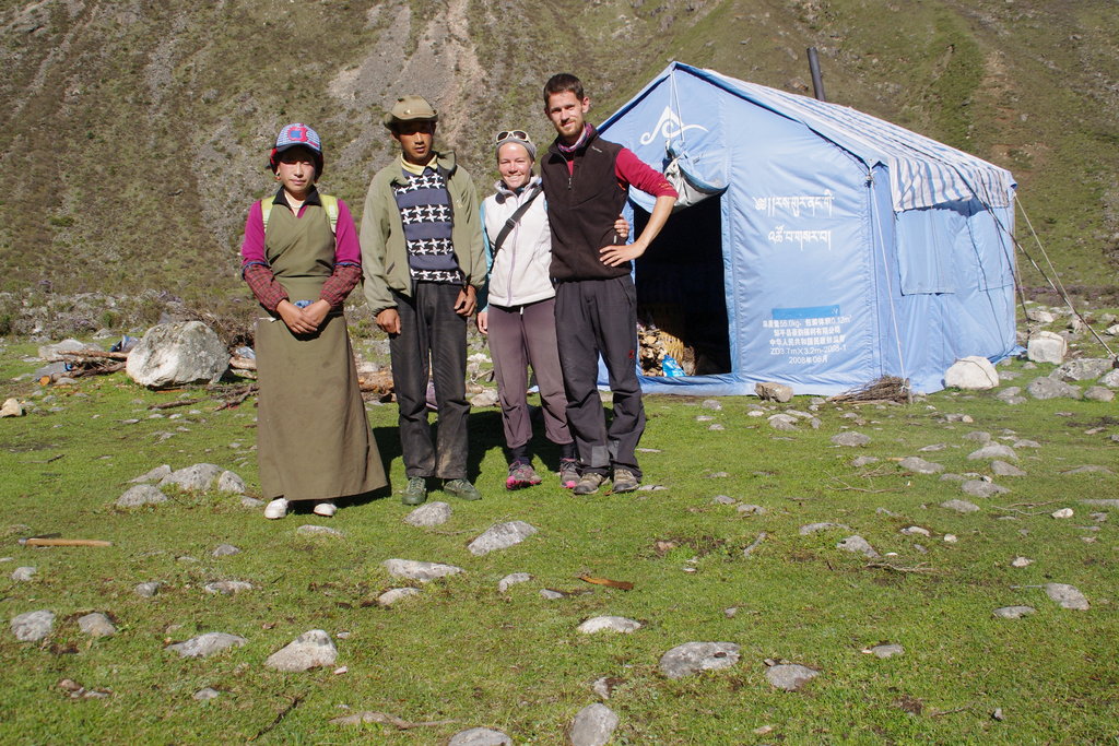 Notre homme se propose de soulager Lætitia pour l’aider à traverser en prenant son sac. Pour des gens qu’on annonce sauvages ils ont plutôt l’air gentlemen. Il nous conduit ensuite vers le camp de tentes où il habite et nous offre le thé. Tous les chinois à qui nous avions posé des questions sur le trek nous ont suggérés de faire attention aux gens des montagnes. Ma foi, les clichés volent rapidement en éclats. Nous nous retrouvons avec 3 sympathiques tibétains tout sourire. Ils nous propose de dormir sur place mais nous sommes hésitants car nous aurions bien marché un peu plus. Finalement nous prenons la décision de poursuivre. Ils nous indiquent la direction à prendre, mais leurs descriptions vagues dans cette purée de pois nous laisse perplexe. Nous poursuivons un peu et entendons soudain des voix qui nous appellent à travers la brume. Un nouvel homme vient à notre rencontre et nous conseille de nous poser pour la nuit. Il est vrai que dans le brouillard ce n’est pas trop prudent mais nous devons suivre une rivière, ce qui reste tout à fait faisable pour l’instant. Après quelques explications il nous pointe à son tour une direction qui nous parait meilleure cette fois et nous souhaite bonne route.