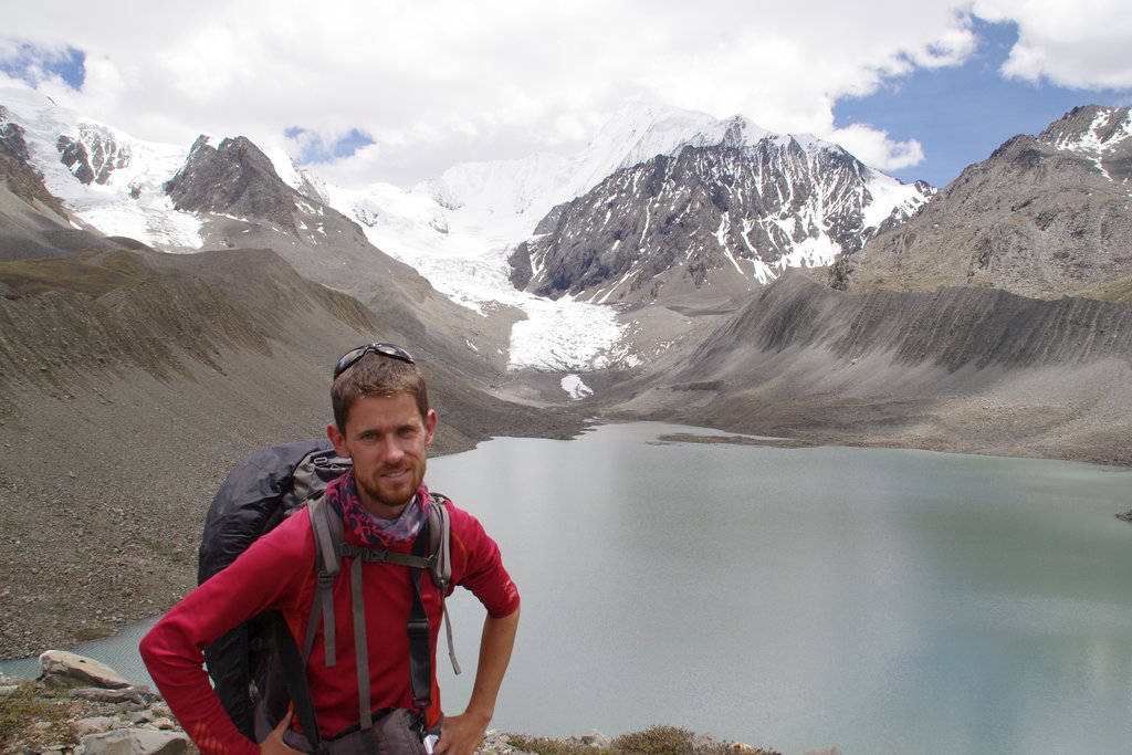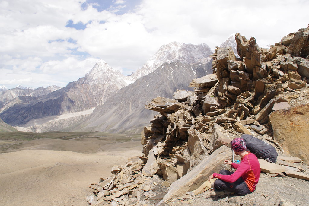 Finalement nous prenons congé de nos charmants hôtes qui s’en vont eux aussi à la chasse au trésor. Le chemin poursuit sa montée tranquille à travers les arbustes fleuris, puis se redresse finalement à l’approche du col. Le petit sentier dessiné dans l’herbe s’est progressivement effacé et nous en venons aux méthodes pifométriques pour deviner où il a bien pu partir. À force de grimper nous finissons sur un lac gisant au pied d’un beau glacier. Nous avons tiré trop à gauche mais la vue en vaut bien la peine. D’ici, en plus d’admirer les sommets blancs immaculés, nous avons aussi un beau point de vue sur la longue crête où se niche quelque part notre fameux col. Nous distinguons au petit décroché qui semble faire l’affaire et prenons droit vers lui. Nous commençons à être bien haut et cela se ressent à chaque pas. Le souffle est court. Notre intuition était la bonne. Le petit décroché est décoré de quelques drapeaux tibétains, c’est donc bien là qu’est le col. Les derniers mètres sont longs à grimper, mais finalement nous y sommes. 4900m.