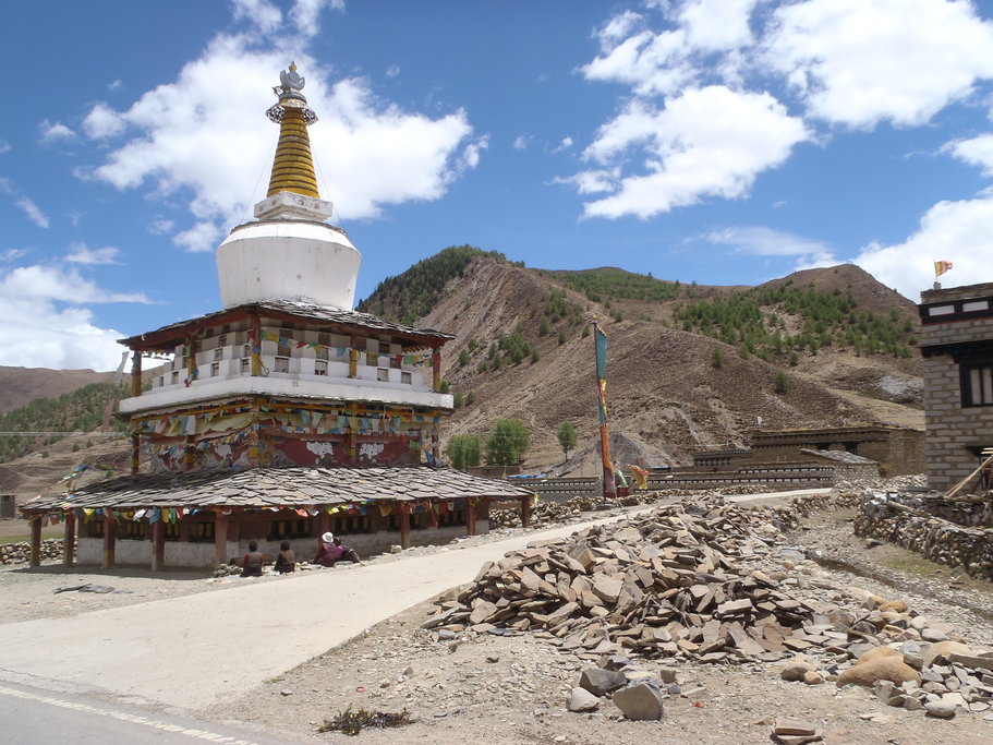 Ce n’est que vers 14h que nous décollons de Daocheng. Les vêtements sont tous propres et les sacoches débordent de vivres. La ville est toute petite et nous en sommes très vite sortis. Tout autour les montagnes sont pelées, peu de végétation n’apparaît et seul un petit filet d’eau traverse la plaine aride. Les villages qui jalonnent la route sont faits de cette architecture tibétaine si reconnaissable. De grosses maisons imposantes aux murs de pierre épais en léger trapèze percés de fenêtres de bois sculptées et souvent peintes comme les poutres massives qui composent la charpente. Des stupas et autres gompas viennent finir ces tableaux ô combien classiques dans des tons blancs, rouges et jaunes. Si les maisons sont si grandes c’est qu’elle servent en fait de fermes. Sur le toit plat, le blé sèche au soleil, au rez de chaussée c’est l’étable qui siège et la famille occupe l’étage. Un seul bâtiment pour couvrir tous les besoins de nos gros corps de ferme.