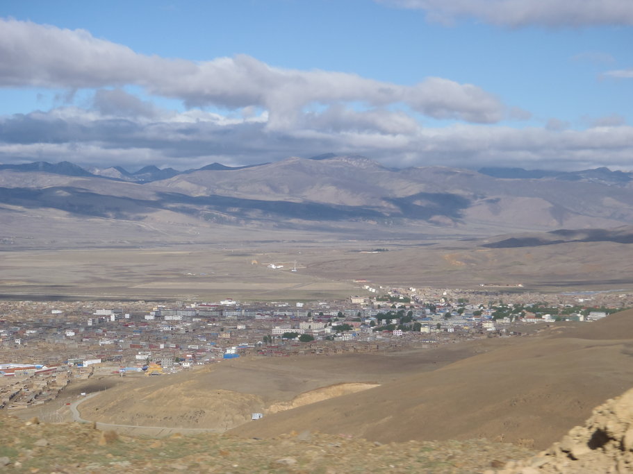 Nous arrivons enfin au col, à 4696m, et redescendons un peu pour trouver un endroit abrité du vent pour pique niquer. Les nomades qui ont leur tente non loin sont curieux de nous voir faire la popote au réchaud. Une bonne soupe de nouilles instantanées agrémentée de tomate, de carotte et d’ail. La route se poursuit en descente jusqu’à aboutir dans une vallée tout sèche où nous accueil un bon vent de face. Les villages couleur de terre se fondent dans ce paysage semi-désertique d’où ressorte les temples blancs immaculés.