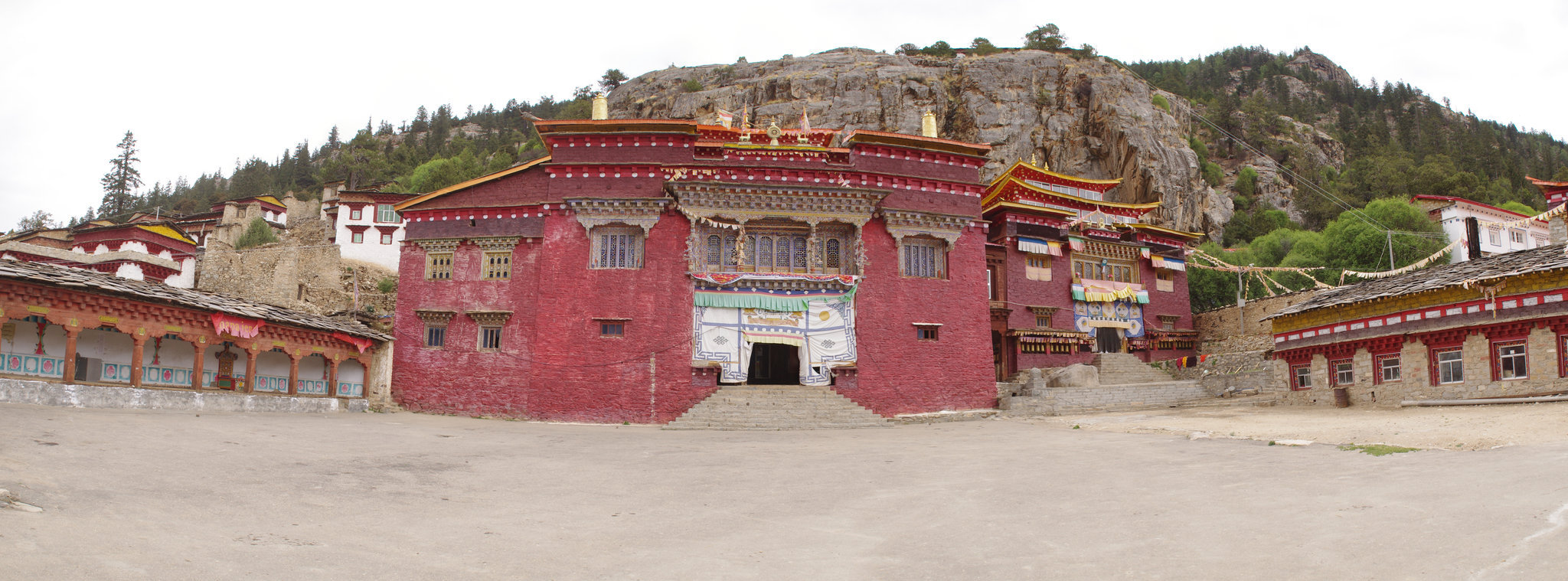 Les hommes et les femmes de ces hauts plateaux ont des peaux très tannées avec des pommettes rouges usées par les éléments. Leurs yeux très bridés se ferment encore plus lorsqu’ils nous lancent de grands sourires. La route monte doucement en longeant une rivière aux eaux opaques couleur café au lait et nous mène vers le monastère de Xiongdeng qui fait partie de la dizaine de monastères tibétains de la région. Posé sous une falaise de roche grise il contraste de manière éblouissante avec ses murs blancs et ses toits rouges. Nous nous accordons une pause pour lui rendre une visite de courtoisie. Nous avons ratés tous les autres et aimerions bien en voir au moins un. Il est entouré d’un mur d’enceinte garni de moulins à prière. Comme à l’accoutumée, la plupart des boiseries sont décorées. À l’intérieur il faut traverser une grande cour vide pour atteindre le temple principal.