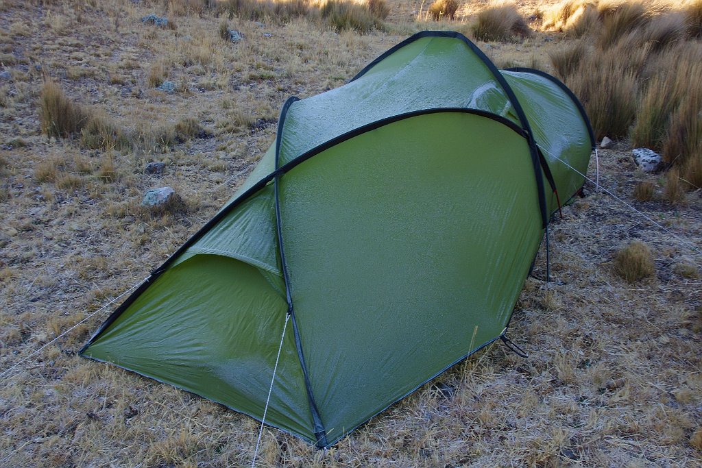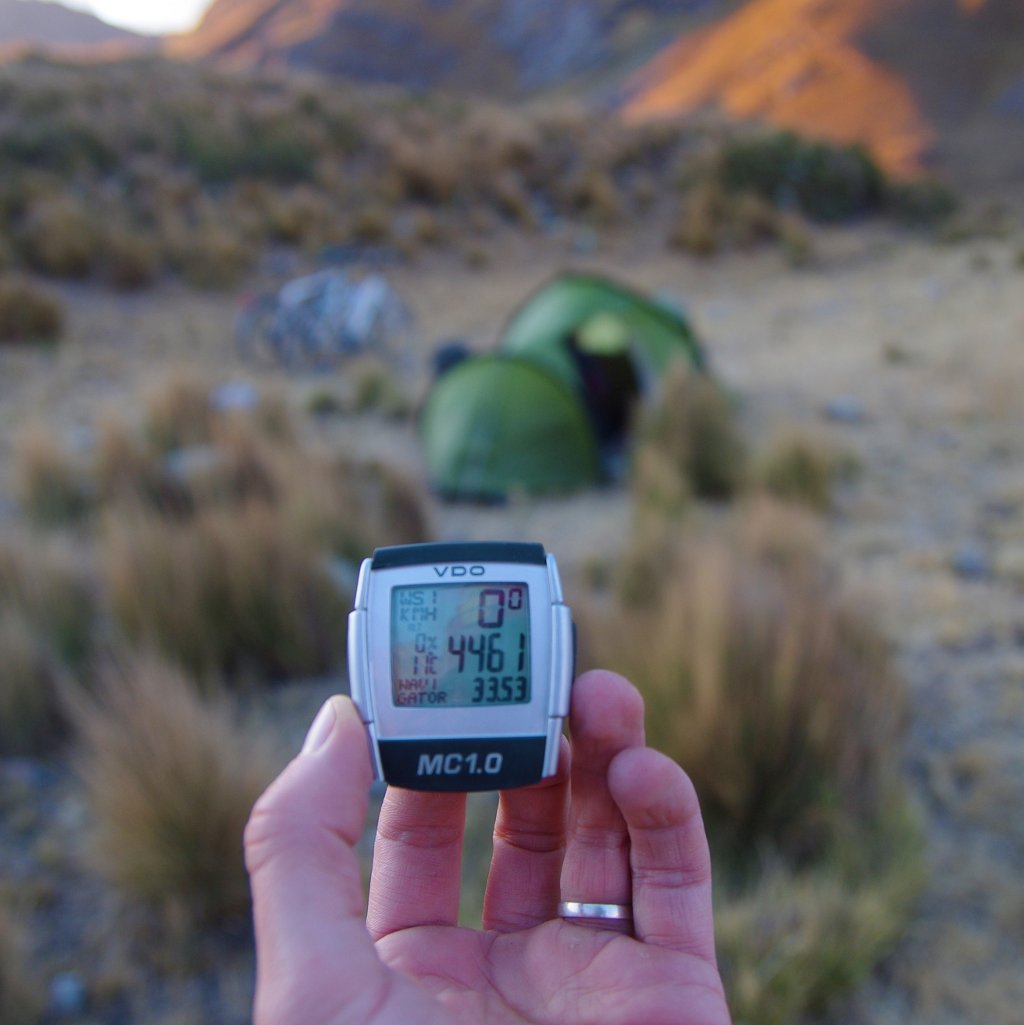Nous redémarrons ensuite la route avec un grand sourire en travers du visage. Après la ronda campesina et la danse folklorique quelles autres surprises pourront bien nous attendre ? Le chemin se poursuit et nous grimpons toujours. Nous savions dès le départ que cette journée ne se ferait qu’en montée. La route semble se redresser et l’altitude aidant, chaque coup de pédale nous coûte un peu plus que le précédent. Il nous faut un endroit avec de l’eau pour pouvoir cuisiner et pour l’instant l’eau reste loin de la route. Enfin, sur le coup de 5h20 nous trouvons un endroit propice pour poser la tente. Un peu en contrebas de la route, sur une herbe grasse à peu près protéger du vent qui s’est levé. Nous sommes aux alentours de 4400m. La tente est vite posée et le réchaud est démarré juste au moment où arrive la nuit. La température chute brusquement et Laeti se glisse dans son duvet. Seb le cuistot du soir prépare une bonne soupe et un copieux plat de pâtes pour recharger les calories perdues dans la journée. Puis vient l’heure tant attendue de dormir.