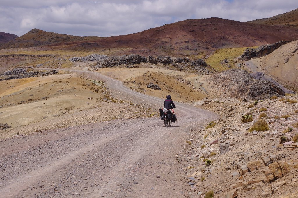Notre fine équipe ouvre les yeux avec les premiers rayons de soleil. L’intérieur de la tente est givré et le thermomètre indique -1°C. Honnête pour cette altitude. La tente est toujours à l’ombre et il faut un peu de mental pour se sortir du duvet. Le réchaud se refusant de fonctionner, nous redécollons rapidement. Les quelques coups de pédale nécessaires pour remonter les 15m qui nous séparent de la route nous coupent le souffle et nous rappellent l’altitude à laquelle nous sommes. Quelques secondes pour le reprendre et nous reprenons le chemin où nous l’avions laisser la veille. 400m nous séparent du premier col. Après quelques kilomètres et quelques virages nous l’apercevons enfin. Le compteur affiche 4765m. Et la route se met à redescendre pour la première fois depuis Pachacoto. Quel bonheur d’avancer sans effort. En plus la piste et très correcte, ce qui nous laisse vraiment profiter de cette descente. Et quelles vues. Depuis le début de la piste, nous en prenons vraiment plein les yeux. Les montagnes nous offrent une myriade de couleurs, passant du bleu au jaune, du vert au rouge, au marron, au noir, toute une palette de couleurs ocres et pastels.