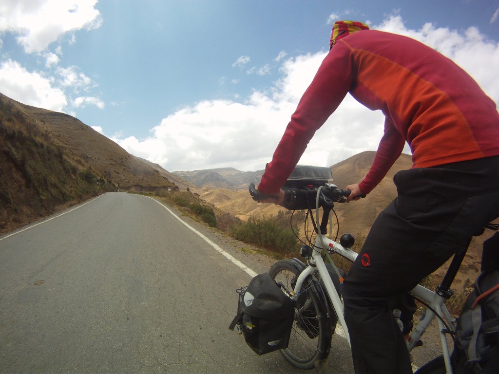 Nous nous remettons en route le lendemain pour ce que nous croyons être 12kms de montée. Sans doute un typo dans le profile du cycliste qui nous l’a donné car en réalité c’est pas loin de 32kms qu’il faut monter pour atteindre les 4000m d’altitude à la Corona del Inca, petit sommet emblématique du coin. Forcément, la montée nous paraît interminable, mais les 45kms de pure descente qui suivent n’en sont que plus jouissifs. devant nous la route serpente à flanc de montagne à perte de vue. Chaque virage découvre une nouvelle vallée et un nouveau tronçon de route en descente. 45kms et 2000m … je me répète sans doute un peu, mais quel pied ! Au fur et à mesure que nous descendons, la température augmente et la végétation change. Nous retrouvons des bananiers, des avocatiers et tout un tas d’autres espèces que nous n’avions plus vu depuis un bon moment. Les faciès aussi évoluent.