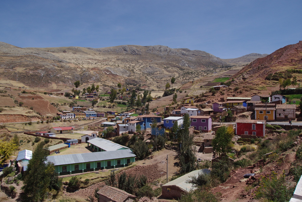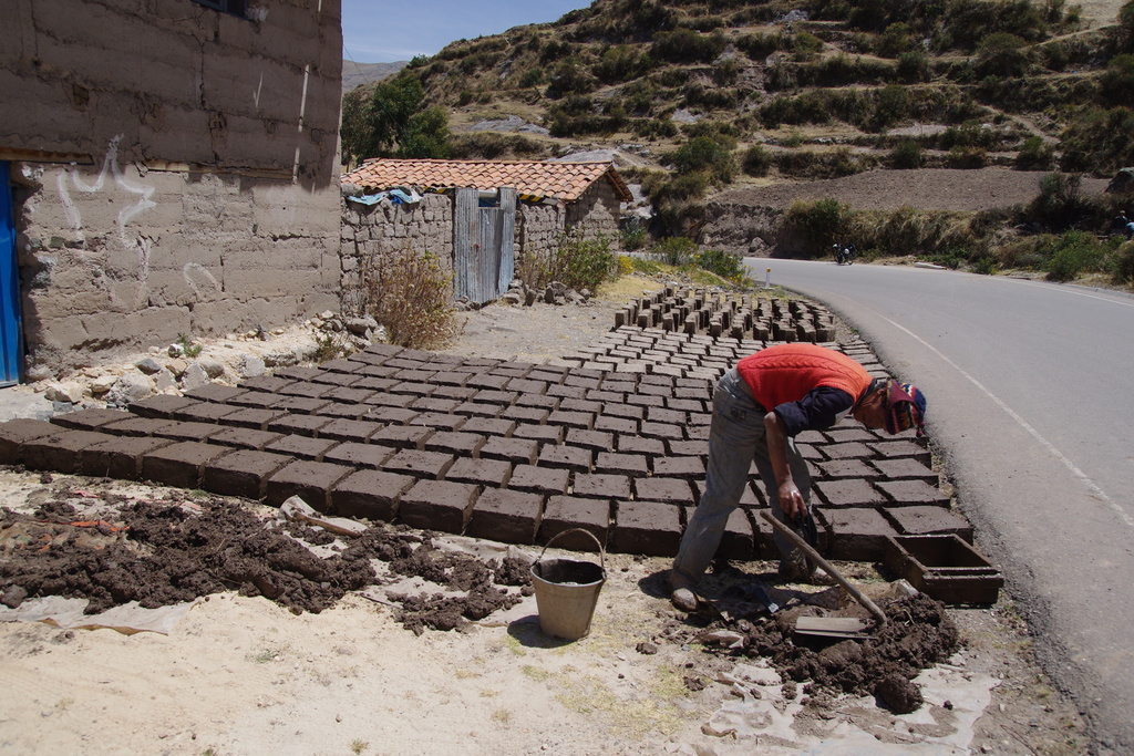 Nous commençons la journée un peu tard car nous avons du mal à démarrer. Il y a certains jour comme aujourd’hui où nous traînons un peu plus que d’habitude. Peut être que la grosse journée de montée qui nous attend nous travaille inconsciemment. Nous remontons les vélos du fond du jardin avec l’aide du petit garçon de la maison qui nous observe intrigué. Notre première rencontre de la journée se fait avec des chiens assez agressifs. Comme les propriétaires ne se soucient guère de la rappeler nous en venons aux cailloux qui sont souvent assez dissuasifs. La rencontre suivante est bien plus agréable. Nous arrivons dans un village où se déroule une fête patronale en l’honneur de la vierge. On nous offre un verre de chicha de maïs blanc pendant que nous observons les costumes et la fanfare. S’ensuit une courte descente qui ne laisse pas le temps de se refaire les jambes durant lequel nous traversons un des très rares villages dont les façades des maisons sont peintes de diverses couleurs vives. Ajouté à cela le retour des écoliers, ce village respire la gaieté. Nous nous arrêtons au bord de la route où un homme s’échine à préparer des briques de terres séchées pour la construction de sa maison. Il accepte que l’on prenne des photos moyennant 1 sole. Au Pérou, tout se monnaye et étonnamment dans cette région pourtant peu touristique c’est encore plus le cas. C’est la première région où l’on vient nous voir pour demander directement de l’argent. Pendant la pause pique nique, une femme vient nous présenter un enfant qu’elle dit orphelin. Plus tard, deux adolescents nous rattrapent en vélo pour discuter et finissent par nous sortir leur petit discours bien rodé.