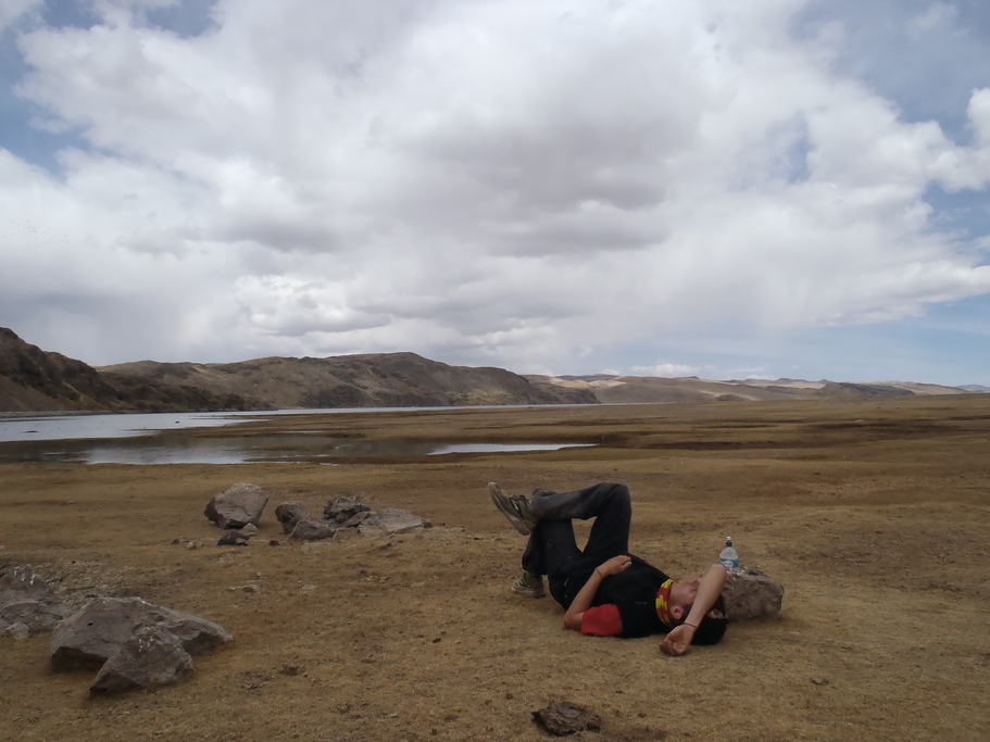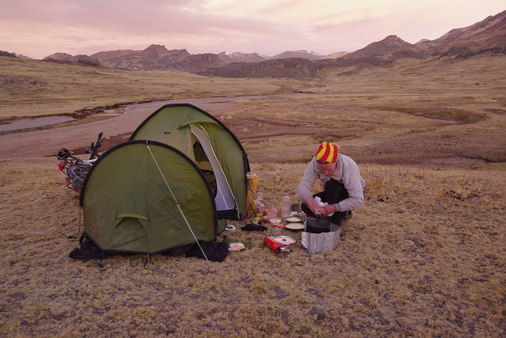 Nous passons une partie de la matinée à visiter cette jolie ville coloniale nichée au milieu des montagnes, dotée de places charmantes et de belles églises qui sont malheureusement ouvertes que pour les offices. Nous faisons le ravitaillement au marché, puis nous décollons. Dès la sortie de la ville, la route se transforme en une piste poussiéreuse très emprunter. Nous nous retrouvons constamment dans des nuages de poussière et de gaz d’échappement. L’état de santé de Seb, ainsi que sa motivation se dégrade à chaque kilomètre. A 16h nous n’avons fait que 27 km. Nous arrêtons alors un pick-up qui nous déposera 15kms plus loin, pas un de plus. La route est enfin agréable. Elle traverse des prairies couvertes de Llamas. Laeti installe la tente au bord de la rivière pour que Seb puisse se mettre rapidement au chaud afin de récupérer. A cette altitude élevée il fait rapidement froid. Nous nous couchons rapidement après avoir profité du spectacle du coucher du soleil qui rougit les sommets alentours.