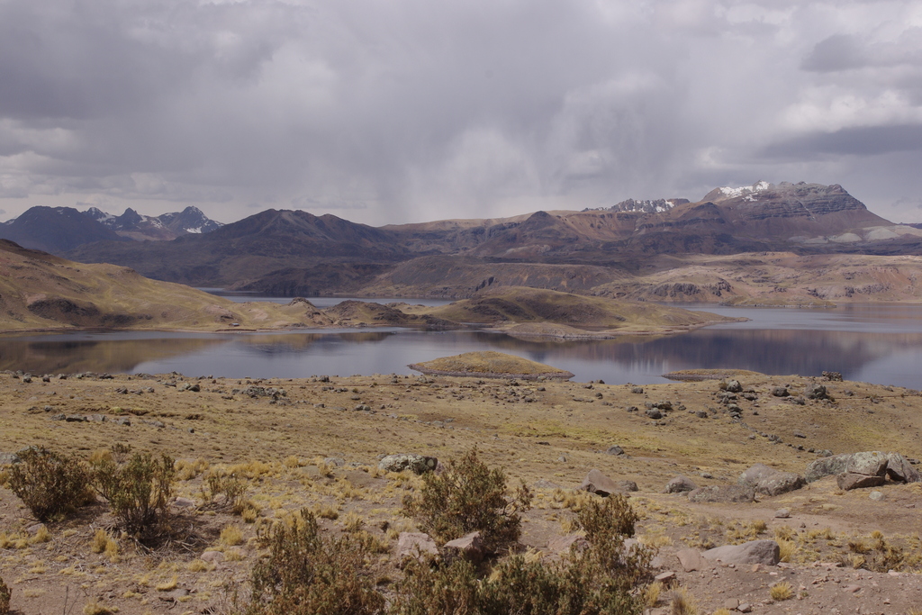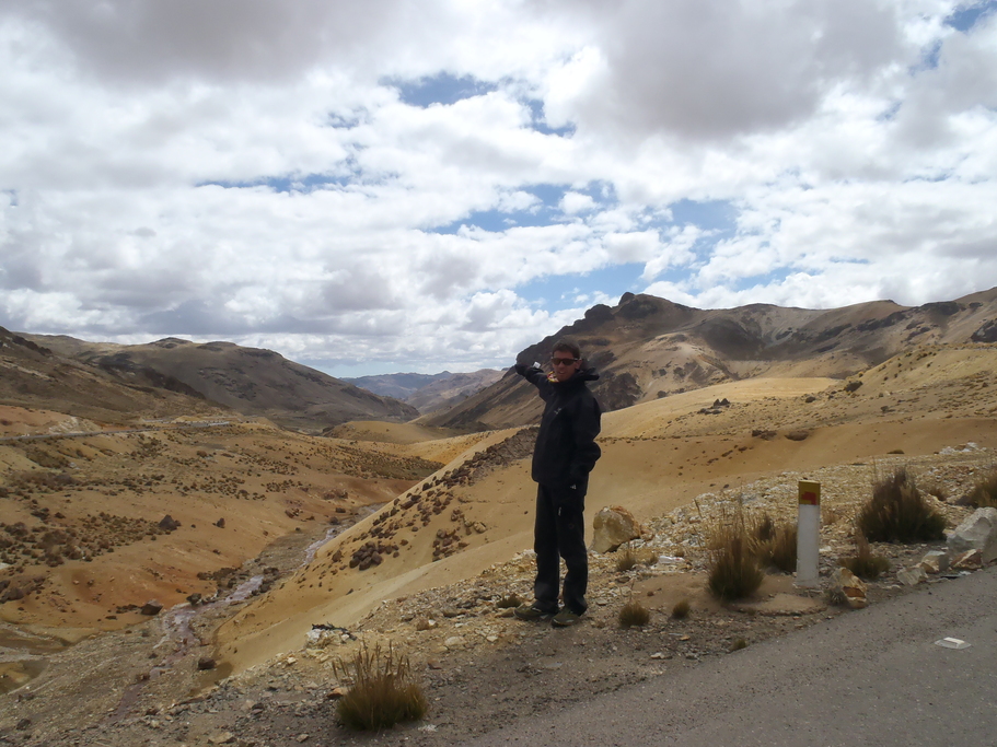 Après avoir batailler pour remonter la vingtaine de mètres qui nous séparent de la route, nous démarrons la montée avec le vent dans le dos. Le plaisir est de courte durée. Après un virage en épingle, nous nous retrouvons avec le vent de face qui nous fatiguera toute la journée. Nous sommes partis pour un col à 4800m. Nous arrivons à un premier village terne et triste, Llicapapa. Nous passons ensuite des zones de patûrage pour finir dans des paysages minéraux qui rivalisent de couleur et nous font oublier la difficulté de grimper des cols à plus de 4000m d’altitude. C’est dimanche, il y a peu de circulation ce qui participe d’autant à notre plaisir. L’altimètre est dans le choux et nous n’arrivons pas à voir la fin de cette sacrée montée. Nous y arrivons enfin après quelques virages en épingles. dans le dernier virage nous avons même la chance d’apercevoir des vigognes qui s’enfuient comme des antilopes. Nous sommes sur l’une des routes asphaltées les plus hautes du monde. Il est maintenant le temps d’entamer une superbe descente. En quelques kilomètres nous recroisons un diversité de paysages et de flore. Les montagnes se reboisent et les arbres grandissent. Sur la route, nous sommes encouragés par des motards attablés à un restaurant. Nous cherchons à poser la tente, mais dans cette vallée encaissée et bien peuplée les opportunités sont rares. Nous trouvons finalement un endroit à l’écart de la route, en contrebas derrière un talus qui semble faire parfaitement l’affaire. Alors que la nuit est noire et que nous nous apprêtons à nous coucher, une voiture s’arrête au bord de la route à notre hauteur. Quelques silhouettes en descendent, puis disparaissent. Un petit coup de paranoïa nous prend et nous cherchons à observer ce qu’il se passe. Après 20 de vigie à la lueur de la pleine lune, toujours rien ne s’est passé. Nous décidons de nous coucher, pas complètement rassurés. Au final il ne se passera rien.