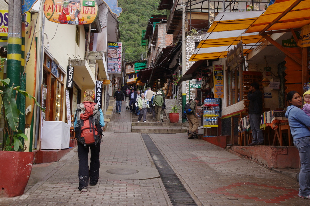 Dommage que le coin soit inaccessible pour les touristes qui sont obligés de passer par le train. Pour nous consoler, on nous sert un maté de coca accompagné de petites douceurs et d’un chocolat. Ca nous fait bizarre de nous retrouver dans ce train où le personnel fait tant de manières et où on nous propose du chocolat plutôt qu’un choclo con queso. Jorgue nous avait averti qu’Agua Callentes est une ville à part. Clairement sortie de terre dans le seul but d’accueillir les hordes de touristes qui se pressent pour aller voir le Macchu Picchu, cette ville est une succession d’hôtels, de restaurants et de boutiques de souvenir. Pas de traces de quartier résidentiel, par de centre historique. Une ambiance étrange bien éloignée des pueblos que nous avons traversés les semaines précédentes. Nous nous offrons un restaurant qui nous avait été conseillé par des français croisés sur le trek de Santa Cruz. Le moindre plat nous coûte quelques jours de caldo de gallena, mais le plaisir est au rendez vous. Tournedos d’alpaca pour Seb et plat végétarien pour Lætitia. Pour la première fois depuis Lima, nous prenons le temps de déguster le contenu de nos assiettes.