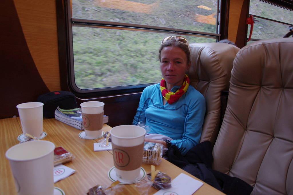 Après un passage à la pâtisserie pour le petit déjeuner où nous craquons pour leur pudding, nous partons sur la route en pente douce en direction d’Urubamba. La vallée sacrée n’a pas grand chose d’extraordinaire et nous sommes vite arrivés. Nous avons rendez-vous avec un membre du réseau SERVAS, Jorgue Manrique. La soixantaine tranquille, Jorgue a passé une bonne partie de sa vie en France et notamment sa jeunesse dans le Paris de Mai 68 dont il garde un souvenir ému. Revenu au Pérou depuis quelques années, il apprécie la vie simple de sa petite ville de province, bien loin du stress et de la météo maussade de Paris. Nous parlons de la France, du Pérou, du vélo et de tout un tas de choses. Puis vient l’heure du repas accompagné d’un petit vin blanc péruvien qui ne laisse pas Sébastien indifférent. Mais déjà il faut quitter notre hôte pour rejoindre Ollantaytambo en collectivo, départ du train pour Aguas Callentes. Le train passe par la seule partie vraiment belle de la vallée. Les falaises abruptes, la végétation et la rivière tumultueuse donne envie à Lætitia de s’y balader.
