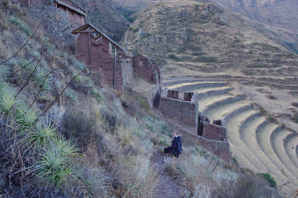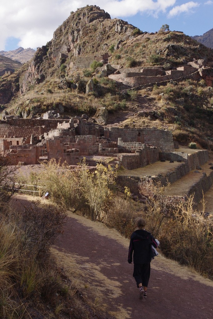 Après avoir nettoyer les vélos, refait le plein de soles et manger quelques crêpes, nous nous reprenons la route qui mène au site de Puka Pukara et Tambomachay, mais cette fois ci en vélo et en montée. La météo est menaçante et nous prenons vite un orage, pile poil à l’heure du pique nique. Nous profitons d’un abri pour manger nos sandwichs. A côté un homme est afféré à tailler une poutre dans une belle bûche. Il profite de sa pause pour venir discuter. Comme la plupart des péruviens, il regarde nos vélos avec envie en nous disant qu’ils ont l’air meilleurs que leurs versions chinoises. Nous parlons de la pluie et du beau temps, de nos péripéties au Pérou puis remettons le cap vers la vallée sacrée. Après 10km de montée, nous n’avons plus que de la descente vers Pisac, destination du jour. Là bas, nous trouvons un hostal charmant pour poser nos affaires et allons visiter les ruines. Pour accéder au site, le chemin monte raide au milieu de terrasses de pierre. 3 km qui nous prennent une bonne heure et qui nous amène lentement au premier poste de garde des ruines.