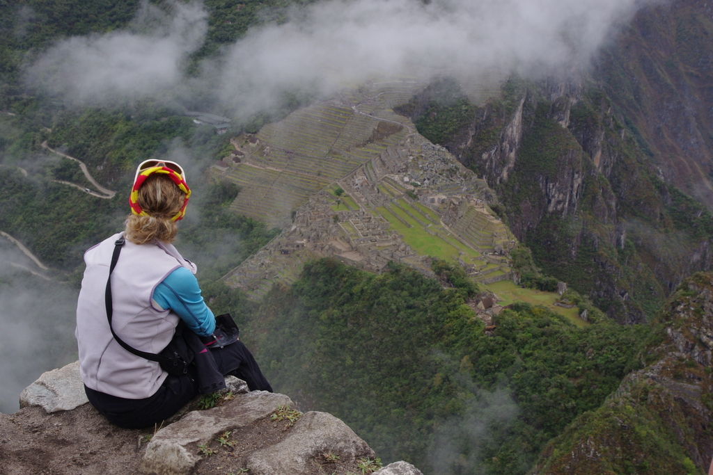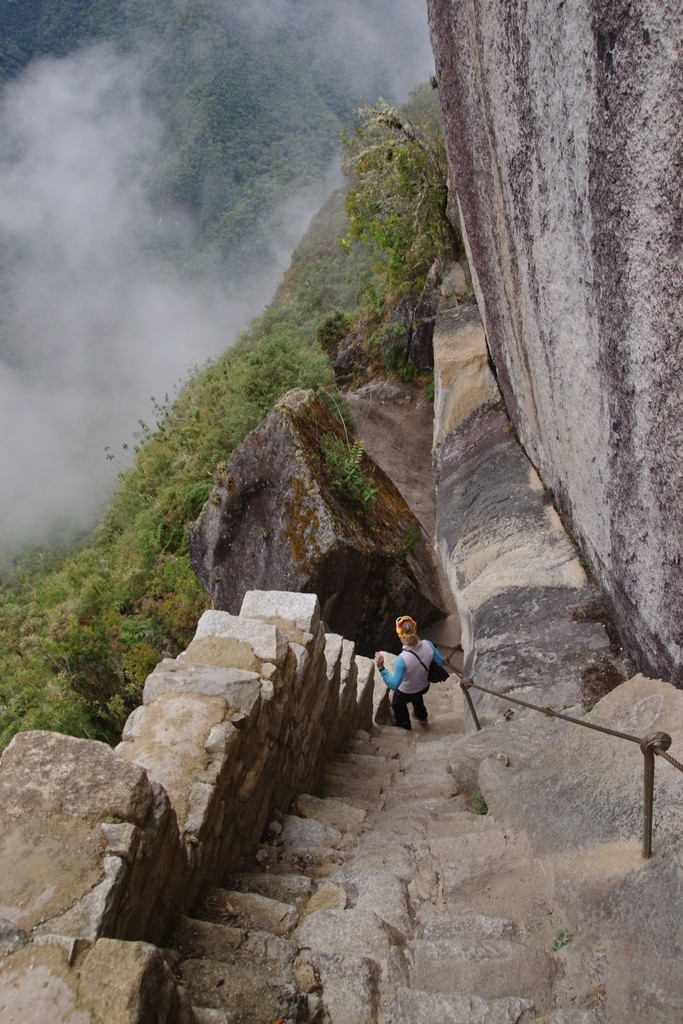 Nous nous levons tôt après une petite nuit dans un hôtel aux murs aussi épais que du papier à cigarettes. Mauvaise surprise, douche reste froide. Un comble dans une ville qui s’appelle Aguas Callentes. Nous nous mettons en route à pied sur le chemin qui monte aux ruines et laissons les bus aux autres touristes. Il fait humide dans cette vallée proche de la selva, la zone amazonienne du Pérou. La végétation est luxuriante et nous entendons chanter de nombreux oiseaux. Nous ressentons le profit de ces 3 semaines passées à 4000m. Ici, vers 2000m nous avons de l’énergie à revendre. Tant mieux d’ailleurs car la journée s’annonce sportive. Ayant pris l’entrée pour Wayna Picchu, à peine arrivés sur le site, nous reprenons l’ascension de ce petit éperon rocheux. La journée est grise et le ciel est chargé. Il pleut même quelques gouttes à intervalle régulier. Mais tous ces petits nuages qui montent de la vallée et nous masquent en partie la vue renforcent le côté mystique du lieux. Arrivés en haut, nous avons la chance d’avoir une vue qui se dégage entièrement sur le Macchu Picchu. Au delà du respect profond que l’on ressent pour les bâtisseurs qui ont réalisé cet exploit, il se dégage une aura mystique difficile à expliquer.