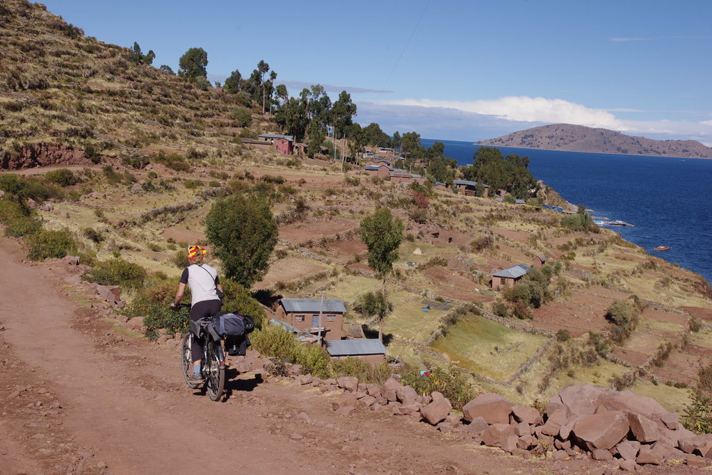 Contrairement au tour classique, nous arrivons de l’autre côté de l’île. Nous prenons le chemin qui mène à la plaza de armas. Se faisant nous croisons des péruviens en tenues traditionnelles, mais nous ne pouvons nous empêcher de penser qu’ils se sont déguisés pour nous. D’ailleurs, lorsque nous sortons des sentiers balisés, ceux que nous croisons sont vêtus normalement. Le passé agricole de l’île se remarque bien dans les nombreuses terrasses dont une bonne partie semble aujourd’hui abandonnées. Tout comme Amantani, les paysages restent très beaux et nous aimons contempler le lac depuis les sommets. Vers midi, nous reprenons le bateau pour la traversée qui nous ramène à Puno. Ce petit détour par les îles nous laisse un petit goût amer et nous donne envie de reprendre nos vélos pour retrouver le véritable Pérou que nous avons aimé parcourir. Après 40 jours dans ce pays, nous sommes aussi curieux d’aller voir de l’autre côté du lac et découvrir cette Bolivie qui nous attend avec ses paysages sauvages.