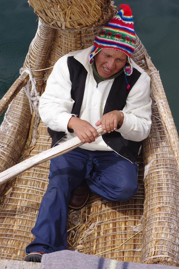 De même que la veille, le décollage s’effectue sous la pluie. Pas question de traîner cette fois car le bateau nous attend. Nous ne voyons pas grand chose au début et restons confiner dans la partie abritée du bateau. cette fois-ci, elle semble vouloir persister, mais heureusement, le soleil finit par l’emporter alors que nous atteignons les Uros. Ces îles artificielles flottantes sont faites de roseaux appelés “totora”. Jadis construites pour échapper à la persécution des populations voisines, ces îles, charmantes au demeurant, sont devenues des attractions touristiques et nous semblent manquer cruellement d’authenticité. Elles sont donc faites d’une superposition de roseaux qui sont constamment renouvelés pour éviter le pourrissement et conserver une élasticité étonnante aux premiers pas hors du bateau. Les autres passagers qui nous accompagnent sont en grande majorité des voyageurs au long cours et ils semblent assez dubitatif face aux scènes qui se déroulent sous leurs yeux. Nous poursuivons cahin-caha sur cette petite embarcation essoufflée vers l’île d’Amantani, à 3h de navigation. Le temps est magnifique et nous profitons de la vue sur le lac et la péninsule Capachica que nous voyons sous un angle nouveau. A l’arrivée sur l’île, on assigne chaque touriste à une famille. Dans cette communauté, l’ensemble du tourisme est géré en rotation. Que ce soit le bateau, le guidage des touristes ou bien leur hébergement dans les maisons, les familles tournent régulièrement pour garder un peu d’espace vital. Il est 13h et nous sommes invité à manger l’almuerzo avant de partir en visite. Contrairement à notre première expérience de Raqchi, nous sommes laissés seuls dans une grande pièce pour manger un repas frugal. Ce premier contact un peu froid nous surprend et nous décidons d’attendre le repas du soir pour nous faire une opinion. Enfin nous sommes laissés seuls pour découvrir l’île. Nous n’avons pas l’habitude d’être baladés et l’inertie du groupe commençait à nous peser un peu. Sur le chemin nous sommes régulièrement accompagnés par de très jeunes garçons qui écorchent tour à tour l’air d’Au Clair de la Lune à la flûte de pan dans l’espoir de gagner quelques soles.