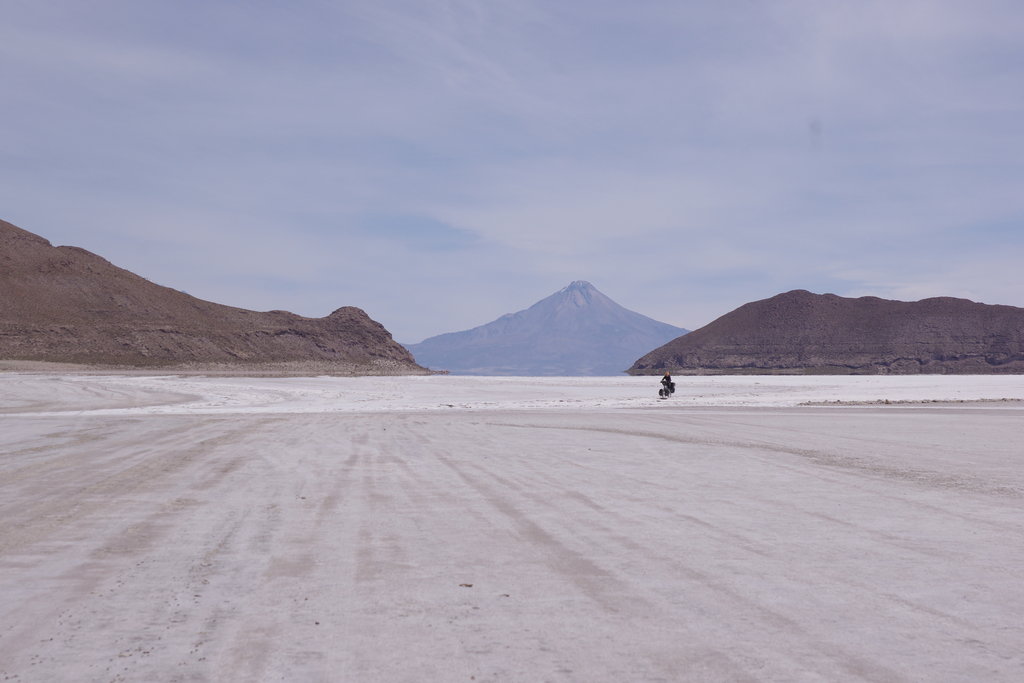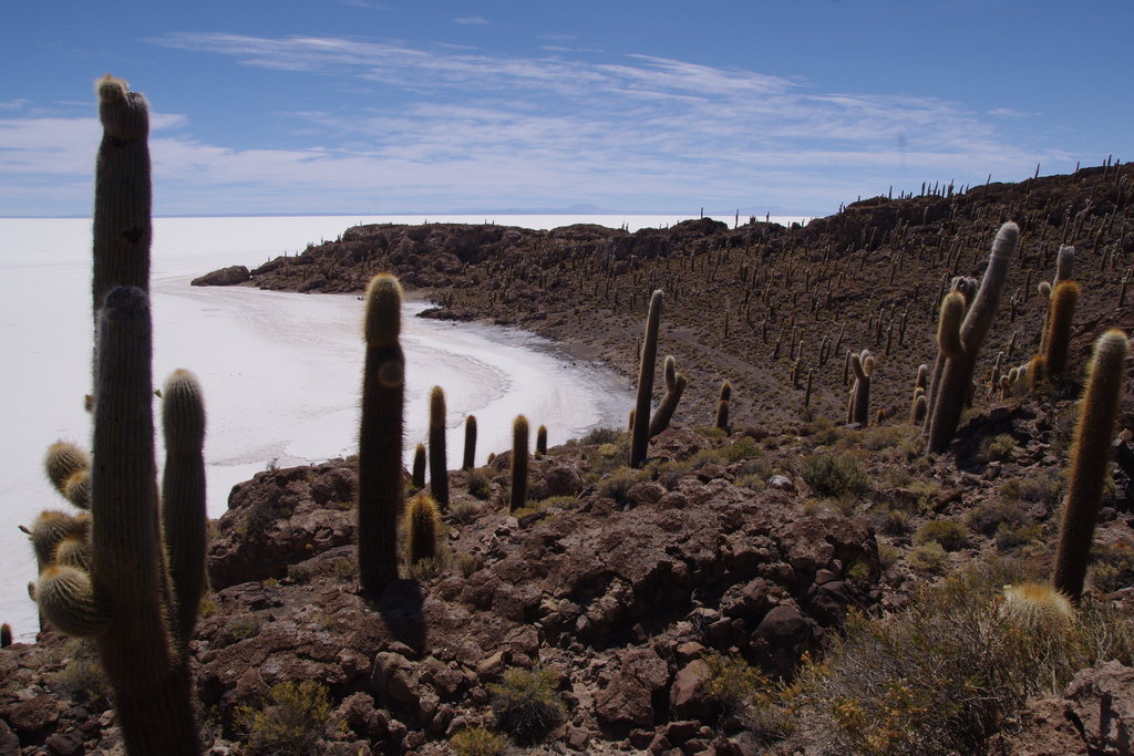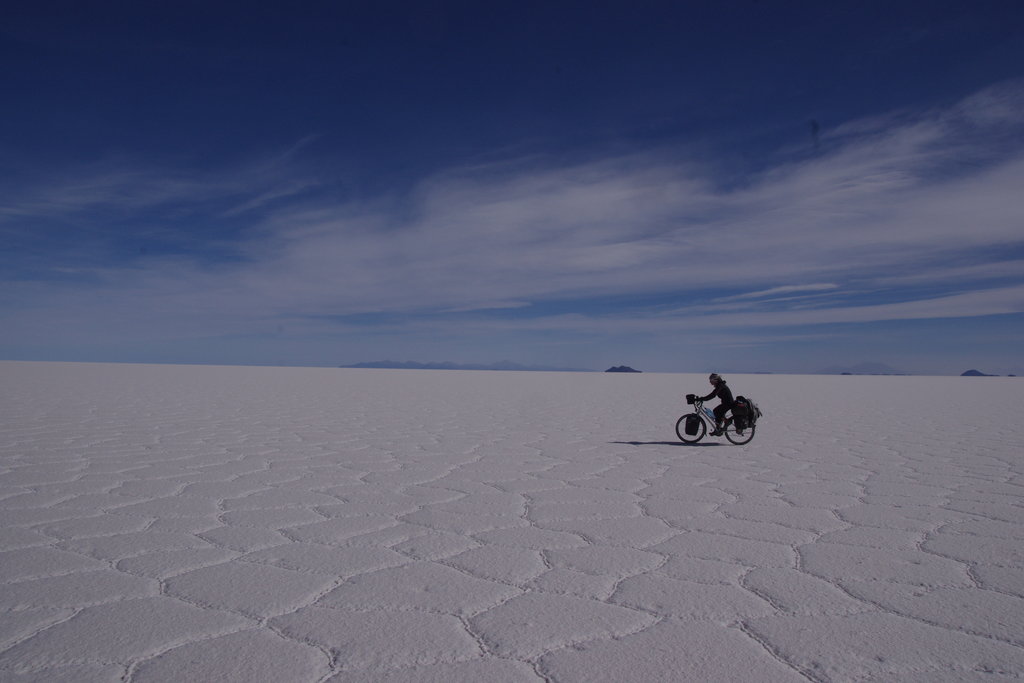Après un départ tardif nous passons les ruelles sableuses de Llica où l’on nous regarde comme deux extra-terrestres avec nos vélos chargés comme jamais. A la sortie de la ville il faut passer par un poste militaire pour accéder au salar. La route commence par longer les bords du salar puis s’enfonce d’en l’immensité de sel par un ponton aménagé pour la saison pluvieuse. Rapidement nous arrivons à carrefour en Y. A droite la route semble avoir la bonne direction mais elle file tout droit dans le salar sans le moindre repère visuel reconnaissable. Il n’y a à l’horizon qu’un petit point discret dont nous n’arrivons pas à déterminer si c’est l’île que nous visons. Nous nous apercevrons plus loin que c’était la Isla del Pescador, une route tout à fait possible pour rejoindre notre bus. A gauche, le chemin prend la direction du volcan Tunupa. N’ayant qu’une carte et une boussole sous la main, nous décidons de la jouer sécurité et prenons la direction du volcan pour rattraper plus loin une autre route qui file plein sud vers l’île d’Inca Huasi. Au fur et à mesure que se dévoilent d’autres petits bouts de terre sur le salar nous quittons les traces de voitures pour partir dans des zones de sel vierges. Pendant 6h durant nous suivons la même direction avec une petite bande de terre en ligne de mire. Sous nos roues le sol du salar évolue régulièrement. Les cellules de sel hexagonales sont parfois concaves, parfois convexes et de hauteur variable. Certaines parties ressemblent étrangement aux murs incas du Pérou. Sur ce grand salar tout plat nous avons la chance de pouvoir aller où bon nous semble. Certaines années de petits murets de sel de 15cm se forment autour des cellules et empêchent les cyclistes de sortir des pistes toutes tracées. Nathanael nous avait annoncé un trafic intense sur le salar. Nous apercevons vaguement une jeep au loin mais le reste du temps nous sommes seuls au monde. A l’horizon les bandes de terre que nous voyons semblent flotter dans l’air. Vers 16h nous atteignons enfin l’île que nous fixions depuis si longtemps. Nous avons l’impression d’accoster à la manière d’explorateurs qui découvrent une nouvelle terre.
