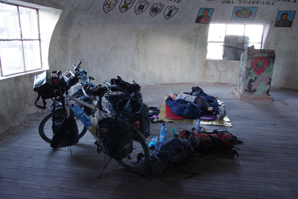 Nous sommes au beau milieu d’une large étendue toute plate et nous cherchons un abri pour la tente. Au loin se dessine un petit monticule avec quelques bâtiments au pied. Il nous faut encore une bonne demi-heure de pédalage sur le sol qui s’est considérablement ramolli pour y arriver. C’est le camp militaire de Chiguarra. Nous y arrivons alors qu’il commence à faire nuit. Toutes les bâtiment ont les vitres brisées et nous ne voyons pas âme qui vive à l’horizon. Nous faisons le tour du propriétaire et décidons de nous installer dans l’un des dômes du camp quand soudain nous apercevons une ombre qui s’engouffre dans un bâtiment plus loin. En fait le camp est bien occupé. Il y a une dizaine de militaires en poste. Avec ce vent qui souffle ils étaient bien au chaud à l’intérieur et ne nous avaient pas vu arriver. Ils proposent de nous installer dans la “salle de opérations”, une des rares pièces avec des fenêtres dans ce camp décrépi. Contrairement aux militaires de Coïpasa ils sont bien plus sympathiques et nous discutons un peu avec eux. Nous nous retrouvons donc à poser notre bivouac entre 4 murs et un toit dans une pièce à la température douce avec de la place pour nous étaler. Quel luxe !