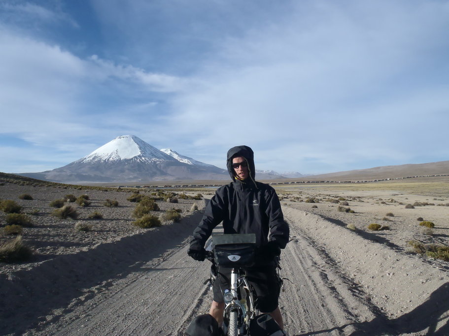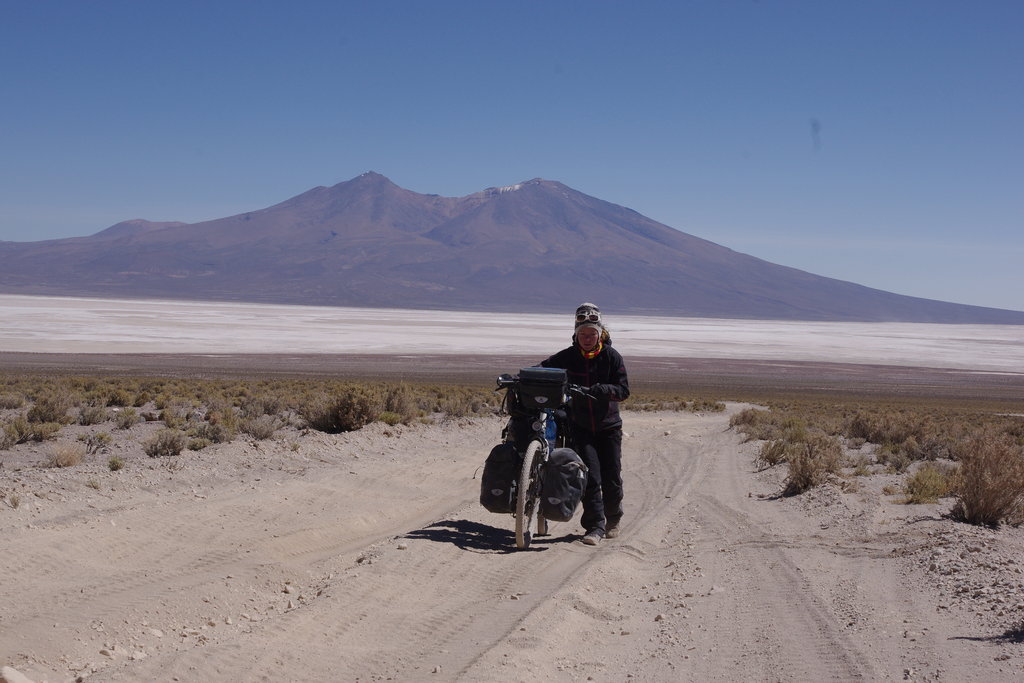 Nous émergeons de notre nuit réveillés par le doux son des 4×4 qui font rugir leur moteur pour monter la petite route sableuse toute proche de notre abri. La nuit a due être un peu fraîche car les bouteilles sont toutes gelées ce matin. Après un petit décrassage du réchaud qui nous fait des caprices nous nous mettons en route pour le village de San Juan. La piste démarre par du sable qui nous oblige à pousser sur les pédales d’entrée de jeu. Rapidement nous remarquons des traces peu communes dans le sable. Comme deux roues de vélo parallèles et au milieu, des pas. Il s’agit d’un compatriote qui vient de traverser le salar d’Uyuni à pied pendant 6 jours en tractant une carriole faite-maison pour transporter tout son matériel. Nous échangeons quelques impressions sur nos modes de voyage respectifs, sur les parages et sur nos itinéraires prévus. Il se dirige comme nous vers les lagunas, mais mettra juste un peu plus de temps pour y parvenir. Nous lui souhaitons bonne chance et nous remettons en selle. Il y a des chemins un peu partout et ils partent dans toutes les directions. Ce n’est pas toujours évident de trouver la bonne voie. Heureusement, armés de nos topos rédigés par de précédents cyclistes nous arrivons à nous repérer dans ce labyrinthe. Le chemin que nous empruntons est très ensablé et il faut encore une fois pousser régulièrement. Cette débauche d’énergie finit par réveiller nos estomacs et nous déjeunons avant d’atteindre San Juan. Là bas nous faisons le dernier ravitaillement avant San Pedro de Atacama dans 5 jours. Il y a ici tout un tas de boutiques qui proposent biscuits, bonbons, bières et vin mais malheureusement pas de fruit ni de légume. Nous faisons le plein d’eau pour 1 jour et demi et filons chercher du pain à l’unique boulangerie du coin, une maison dotée d’un four. Malheureusement la fournée du jour n’est prévue qu’à 16h30. Nous nous rabattons donc sur le pain de la veille qui est bien plus frais que celui que nous mangeons depuis 3 jours. S’ensuit une pause goûter au bord d’une marre où sébastien profite de l’eau pour débarrasser la chaîne et les plateaux de tout le sel accumulé sur les 2 salars. Ça fera un peu de place pour le sable 🙂 Nous quittons San Juan à l’heure où les touristes en 4×4 viennent d’y poser. La piste démarre par une belle couche de sable. A la vue de la plaine qui s’étend sous nos yeux, nous craignons de devoir en baver sur plusieurs kilomètres, mais à notre grande surprise, nous nous retrouvons très vite sur une sorte de salar tout plat et bien dur, un régal surtout avec la petite brise que nous avons dans le dos. Nous avançons droit sur le volcan Ollagüe sur cette surface grisâtre lorsque le vent se met à changer de cap brutalement et nous souffle droit au visage. Il nous faut à nouveau forcer sur les pédales pour avancer.