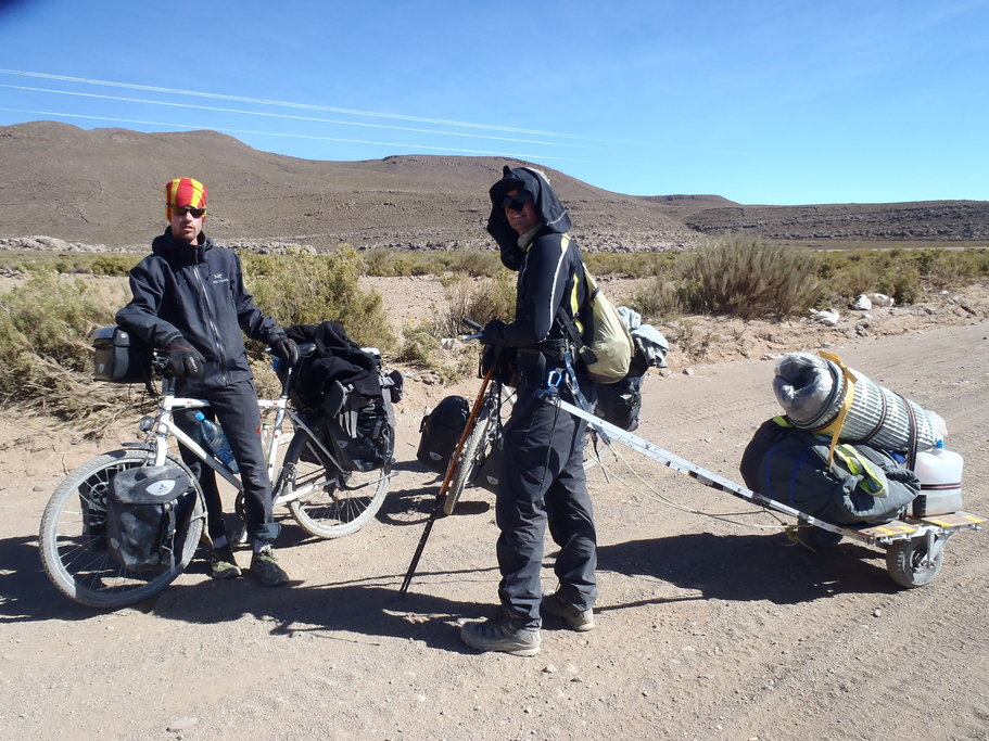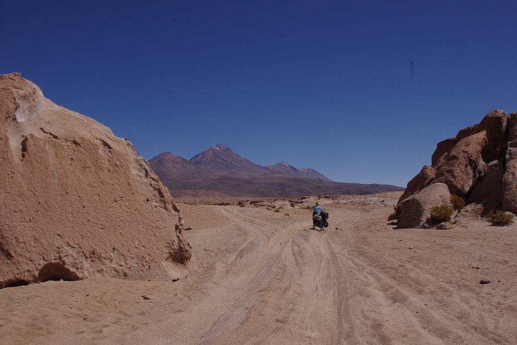 Pour une fois nous n’avons aucun mal à sortir du duvet. En cette heure matinale, la température dans la pièce est encore très bonne alors que la nuit à été glaciale dehors et que les premiers rayons du soleil peinent à faire repasser l’atmosphère au dessus de 0°C. Pas de tente à replier, du coup nous sommes vite prêts et nous décollons une heure plus tôt que d’habitude. Lorsque nous sortons il fait tout pile 0°C. Nous sommes couverts de tout ce que nous pouvons. Pas un bout de peau ne dépasse. La route commence par du plat sur le salar d’Ollagüe avant d’arriver aux pieds des montagnes. Nous devons franchir un premier col à 4200m. Dès le début les chemins s’ensablent. Nous avançons comme nous le pouvons et il faut pousser souvent. Entre le ripio, les tas de sable et les pierres de la taille d’un ballon de foot, la navigation est difficile. A certains endroits, le passage des 4×4 à créé des ornières bien profondes dont il n’est pas évident de se sortir. La température monte rapidement et l’effort intense à fournir nous réchauffe aussi de l’intérieur. Heureusement la vue sur les salar et les volcans nous encourage. Et en voyant les touristes enfermés dans leurs bulles de verre poussiéreuses, nous nous souvenons pourquoi nous avons choisi le vélo. Nous arrivons au bout de 5h après avoir bien entamé nos réserves de biscuits et d’énergie. De l’autre côté du col, la palette de couleurs se garnie à nouveau et nous avons le droit à de l’orange, du vert, du jaune que nous n’avons pas eu depuis longtemps. Les pistes par contre ne sont pas bien meilleures. Ça a beau descendre, nous ne sommes toujours pas très rapides. Nous rejoignons la “route internationale”. C’est une large bande de terre durcie, mais non asphaltée sur laquelle nous avons l’immense plaisir de ne plus avoir de calamina. Pour cette section nous avons 2 topos différents. Un premier indique un chemin à 10km, le second à 20km. C’est au milieu d’une belle descente que nous tombe sur le premier chemin. Après quelques secondes d’hésitation, nous decidons de poursuivre sur cette belle route sans sable 10km de plus. Alors que nos réserves d’eau viennent à manquer nous passons devant un cours d’eau claire avec une belle plage et une vue agréable sur les 2 sommets qui nous encerclent.