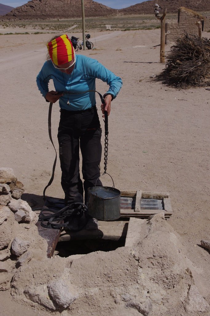 Laetitia déniche un puis à l’ancienne sous un morceau de tôle et nous remontons un peu du précieux liquide à l’aide d’un sceau attaché au bout d’une corde. Réconfortés par cette trouvaille nous reprenons la route si droite, si monotone et qui nous force à pousser de plus en plus souvent. Après de nombreux kilomètres nous retrouvons le salar que nous n’aurions pas du quitter. Entre temps le vent à tourné et cette fois nous l’avons de face. L’heure aussi tourne et nous n’avons toujours aucun signe du village de Llica que nous aimerions atteindre ce soir. Nous croisons un grand-père en vélo qui nous annonce que notre destination se trouve à une dizaine de bornes. Lui file vent dans le dos vers Hizo qui n’est donc pas un village abandonné. Après un premier village qui n’est pas le bon, un col et la tombée de la nuit, nous arrivons enfin à Llica. Il y avait en fait 20km. Nous y trouvons un hôtel où nous partageons la chambre d’un autre cycliste. Nathanael est américain. Il est en Bolivie pour une thèse de sociologie sur l’impact du lithium sur les communautés du salar d’Uyuni. Plutôt que de rester derrière le bureau de l’université de La Paz il a préféré enfourché son vélo pour aller directement sur place poser ses questions aux populations concernées. L’hôtel est assez crade et rempli de gars éméchés en ce dimanche. Nous faisons le plein de vivre pour la semaine qui nous attend et nous couchons rapidement pour reprendre des forces.