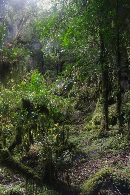 Parmi les nombreuses ballades à faire autour du refuge, une en particulier à retenue notre attention : la montée de l’Arco Iris. L’Arco Iris est un petit sommet qui surplombe la vallée et le chemin qui y mène monte droit sur la falaise en empruntant quelques passage de cordes aux endroits les plus abruptes. C’est une ballade sportive faisable à la journée avec en plus le petit défit supplémentaire de revenir suffisamment tôt pour retourner à la voiture le soir même. Nous partons à la fraîche le ventre plein après un petit déjeuner très agréable. D’entrée le chemin monte sec et nous nous accrochons souvent aux branches pour nous aider. Dans cette pente bien raide, nous avons souvent des petites éclaircies dans les feuillages pour observer les autres sommets en face.