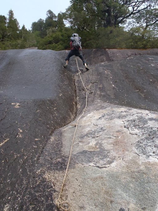 Le premier passage de corde nous fait passer sous un rocher qui ruisselle et détrempe les randonneurs qui ne se pressent pas suffisamment. Les plus rapides ne s’en sortent pas secs pour autant. Viens ensuite un passage où l’on s’étonne que la terre arrive à s’accrocher à la roche et que les arbres arrivent à s’ancrer dans la terre. Mais le tout tiens bon et l’on monte aux racines des arbres comme on prendrait une échelle. Le deuxième passage de corde est au sec cette fois et franchit une belle dalle de granit d’une quarantaine de mètres. Après ce passage, la neige commence à faire son apparition. Par petits tas au début, puis un peu plus jusqu’à la sortie de la forêt où le sol est recouvert entièrement. Nous nous retrouvons donc à marcher sur cette neige encore à peu près dure en direction du sommet que nous n’atteindrons pas par manque d’équipement. Nous profitons des roches non recouvertes pour monter le plus haut possible, puis décidons de franchir un replat mais un bruit suspect dans la neige nous décide définitivement à faire demi-tour.